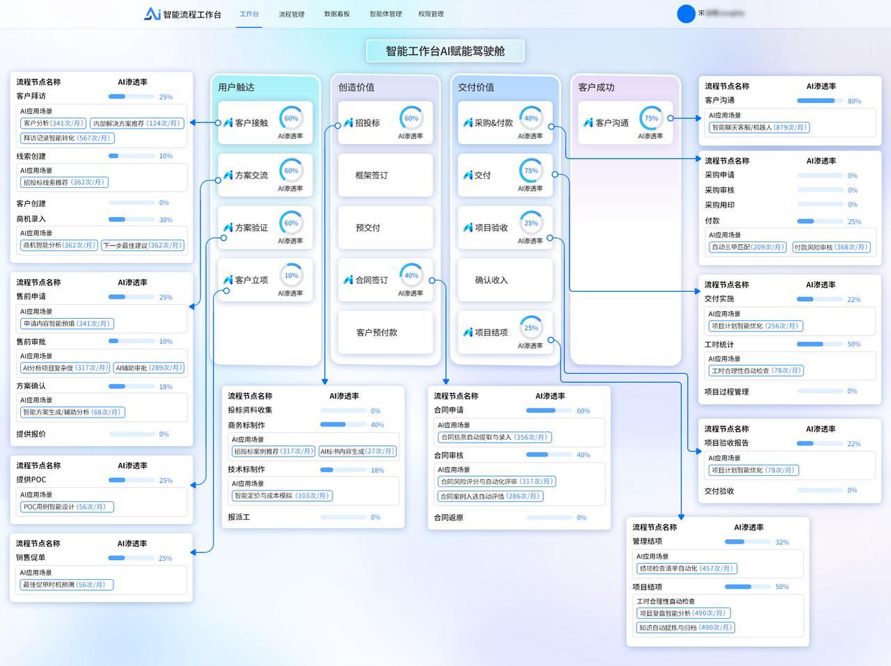 ? 將業(yè)務流程以作戰(zhàn)地圖的形式進行可視化呈現(xiàn),清晰展示流程的各個環(huán)節(jié)、節(jié)點之間的關系以及當前流程所處階段